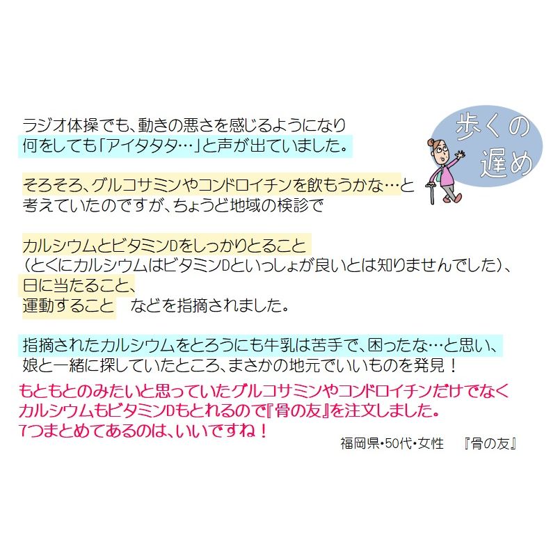 もともとのみたいと思っていたグルコサミンやコンドロイチンだけでなく、カルシウムもビタミンDもとれるので『骨の友』を注文しました。(※うらべ注:7つの栄養がとれる『骨の友』は、10種の栄養がとれる『こつこつLIFE』へ、さらに新しく生まれ変わりました!)