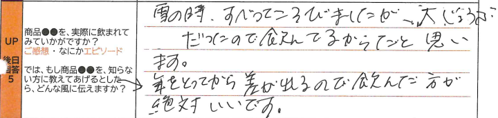 70代 女性 年をとってから差が出るので、飲んだ方が絶対良いです!滑って転んでも大丈夫だった!