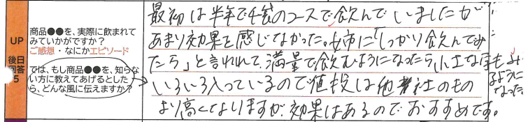 A.最初は半年で4袋のコースで飲んでいましたが、あまり効果を感じなかった。