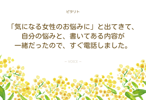 「気になる女性のお悩みに」と出てきて、 自分の悩みと、書いてある内容が一緒だったので、すぐ電話しました。