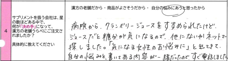 Q4.サプリメントを扱う会社は星の数ほどある中で、何が決め手になって漢方の老舗うらべにご注文されましたか?
