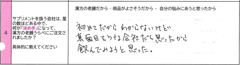 Q4.サプリメントを扱う会社は星の数ほどある中で、何が決め手になって漢方の老舗うらべにご注文されましたか?