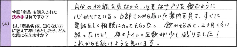 A.自分の体調を見ながら、必要なサプリを飲むように 心がけている。占部さんから届いた案内を見て、すぐに 電話をして相談にのってもらった。 飲み始めて、2ヵ月くらい 経ったけど夜のトイレの回数が少し減りました! これからも続けようと思います。