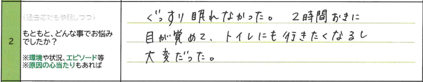 A.ぐっすり眠れなかった。2時間おきに目が覚めて、トイレにも行きたくなるし 大変だった。
