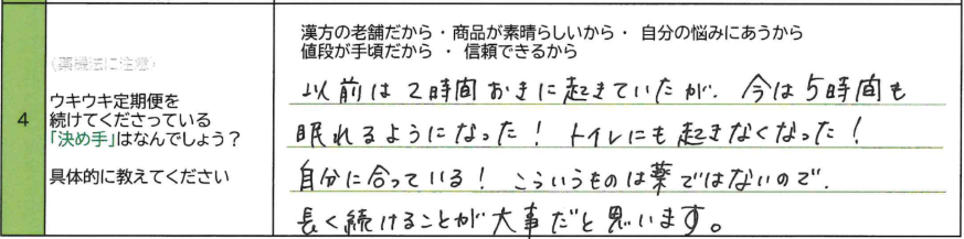 A.以前は2時間おきに起きていたが、今は5時間も 眠れるようになった!トイレにも起きなくなった!