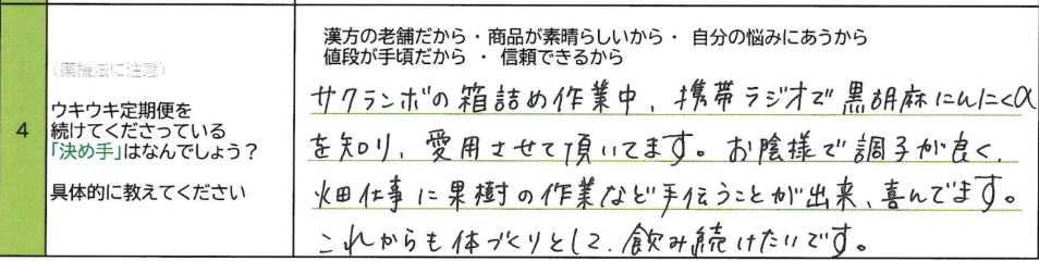 A.サクランボの箱詰め作業中、携帯ラジオで黒胡麻にんにくαを知り、愛用させて頂いてます。お陰様で調子が良く 畑仕事に果樹の作業など手伝うことが出来、喜んでます。 これからも体づくりとして、飲み続けたいです。