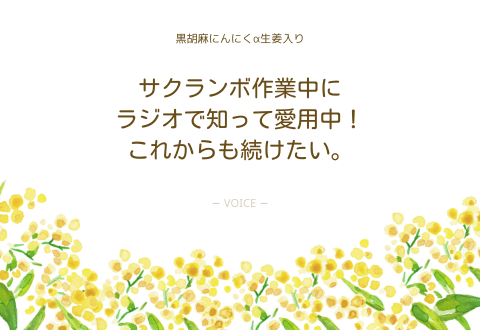 A.サクランボの箱詰め作業中、携帯ラジオで黒胡麻にんにくαを知り、愛用させて頂いてます。お陰様で調子が良く 畑仕事に果樹の作業など手伝うことが出来、喜んでます。 これからも体づくりとして、飲み続けたいです。