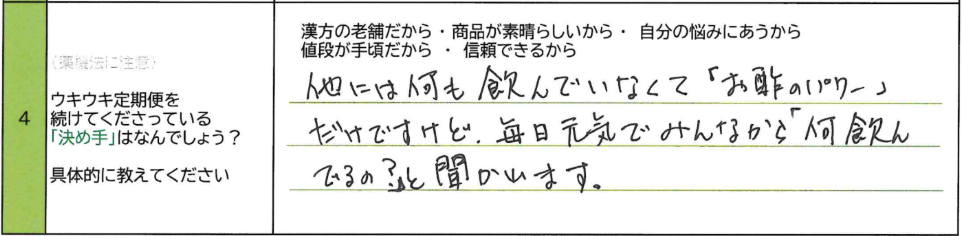 A.他には何も飲んでいなくて「お酢のパワー」だけですけど、毎日元気でみんなから「何飲んでるの?と聞かれます。