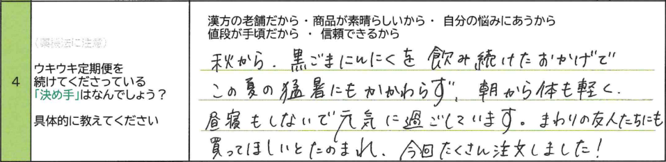 A.秋から、黒ごまにんにくを飲み続けたおかげでこの夏の猛暑にもかかわらず、朝から体も軽く昼寝もしないで元気に過ごしています。まわりの友人たちにも 買ってほしいとたのまれ、今回たくさん注文しました!