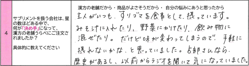 Q4.サプリメントを扱う会社は星の数ほどある中で、何が決め手になって漢方の老舗うらべにご注文されましたか?