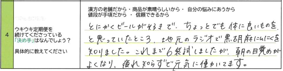 A.とにかくビールが好きで、ちょっとでも体に良いものをと思っていたところ、地元のラジオで黒胡麻にんにくを 知りました。これまで6袋試しましたが、朝の目覚めが よくなり、疲れ知らずで元気に働いてます。