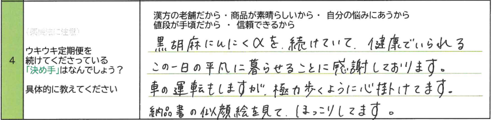 A.黒胡麻にんにくαを続けていて、健康でいられるこの一日の平凡に暮らせることに感謝しております。