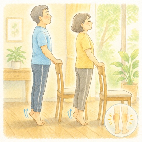 ふくらはぎは“第二の心臓”と言われます。立ったままのかかとを上げてストンと落とすだけの軽い運動で、全身のめぐりが改善します。