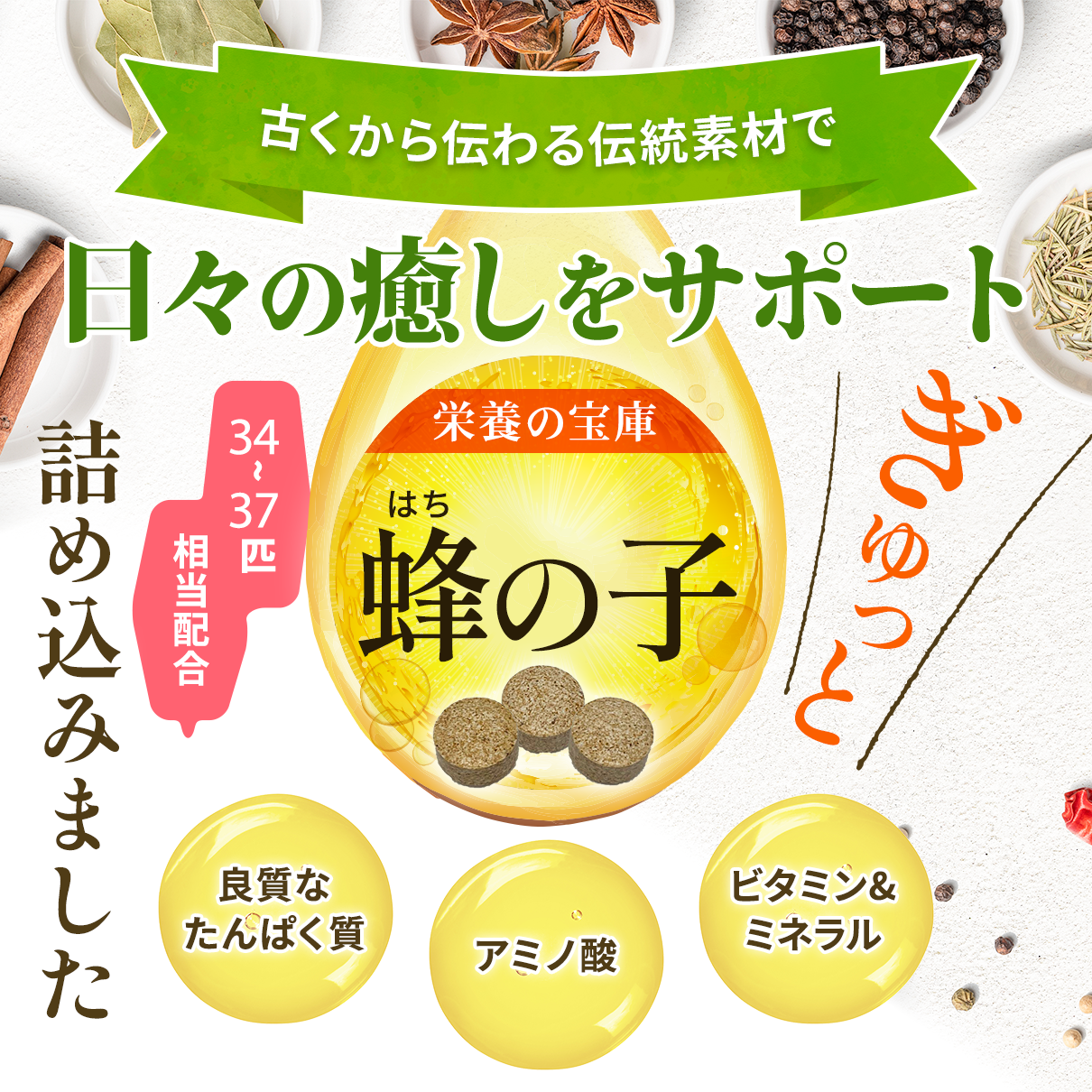 ハチノコ をそのまま食べるには見た目がどうしても受け入れられない、栄養だけ欲しい方のため、ローヤルゼリーや山茱萸(サンシュユ)、向日葵殻(コウジツキカク)など贅沢な組み合わせのサプリメントです。